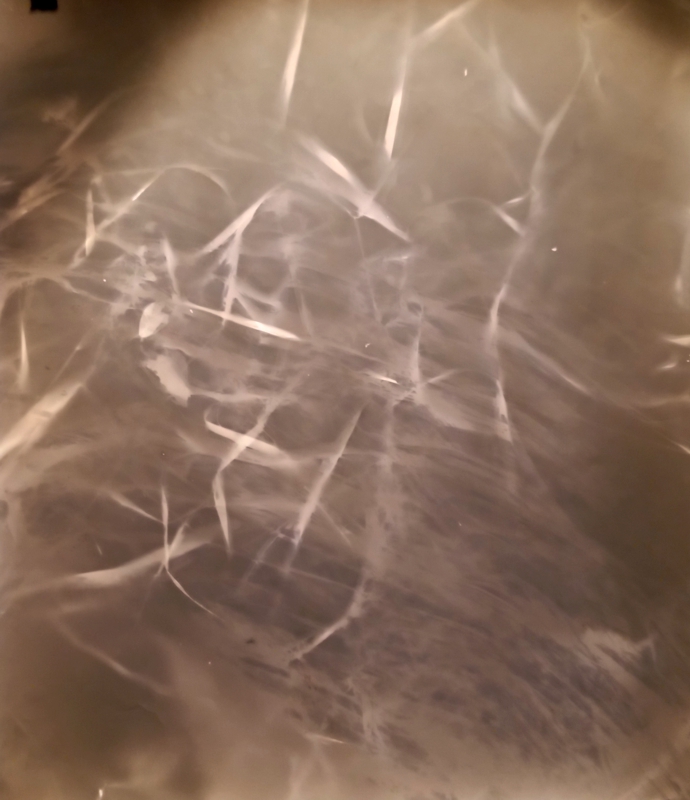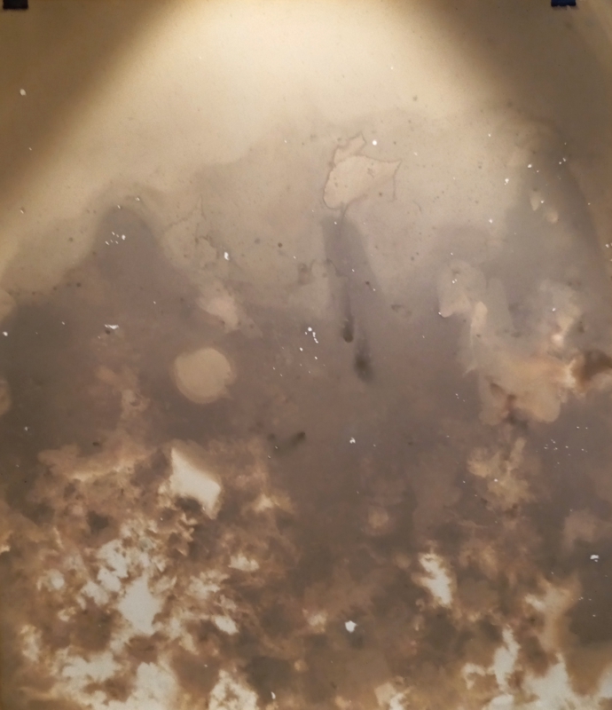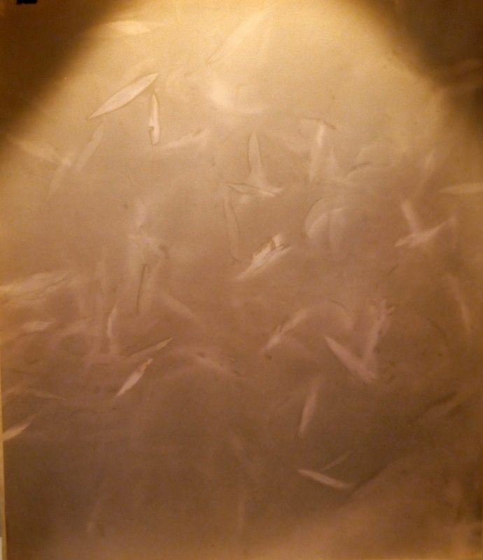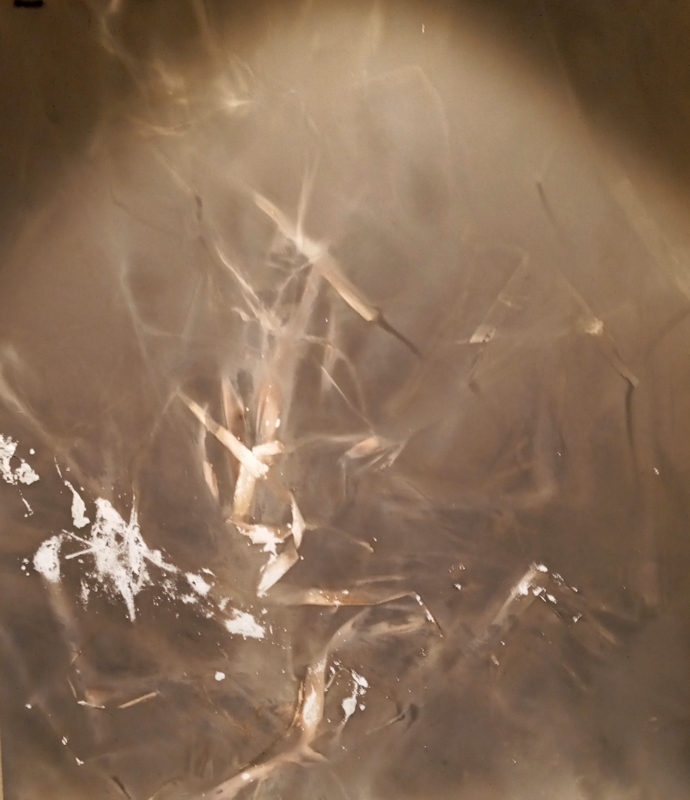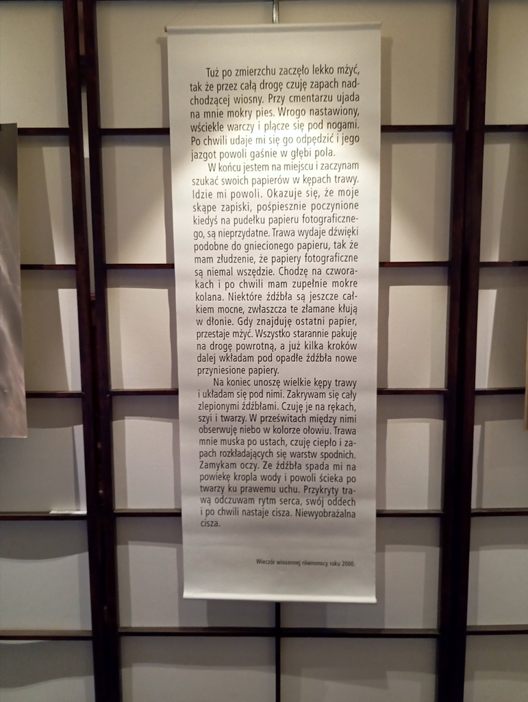 „Papier fotograficzny, brzemienny solami srebra, pozostawiony w naturze i poddawany jej żywiołom niekiedy nawet przez parę tygodni. Często niszczony, pozbawiany czułej warstwy, atakowany pleśnią. Z odbiciem lasu, ciepła rozkładu ślepych koryt rzek, wielkich kęp trawy, spadającego liścia, z odblaskiem na powierzchni wody czy grudą rozoranej ziemi. Jestem zafascynowany możliwościami papieru fotograficznego, jego pracą w czasie, absorbowaniem światła, energii. Ta zdolność pozwala wiernie odwzorować i zachować przemijanie. Układam papiery fotograficzne w naturze już od wielu lat, podczas moich wieczornych wyjść do odległych od miejskiego zgiełku lasów i pól. To mój prywatny, intymny performance, kiedy jestem sam pośród nocy i czuję, że jestem małą częścią tego świata i kosmosu, szukającą własnego miejsca na ziemi. Po tylu latach to uczucie nie traci nic na wartości, lecz przeciwnie, jest silniejsze niż kiedyś. Czasami brakuje mi słów, żeby wyrazić swoje odczucia, ale zostają papiery fotograficzne z maleńkimi zapisami powiewu wiatru, płynącą wodą, spadającym liściem… ze śladem świata“.